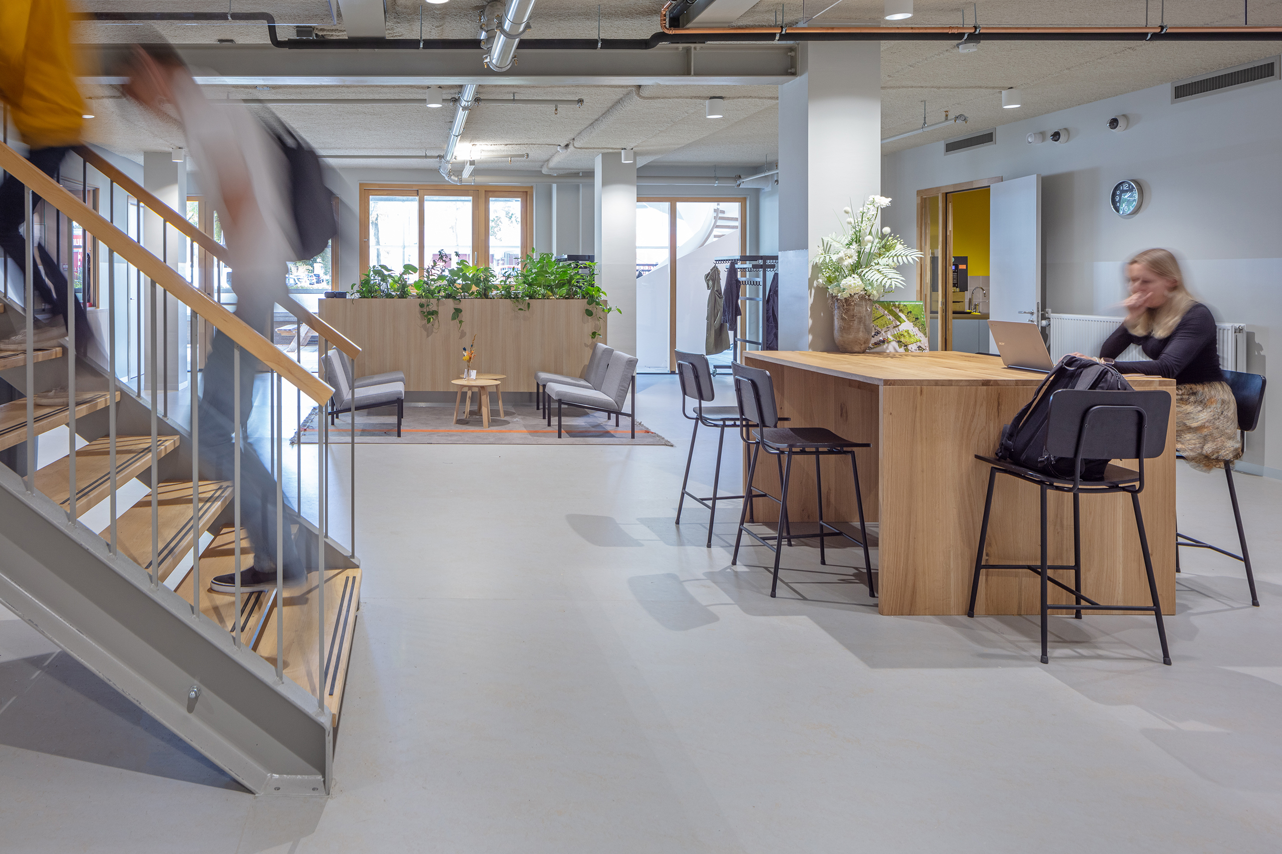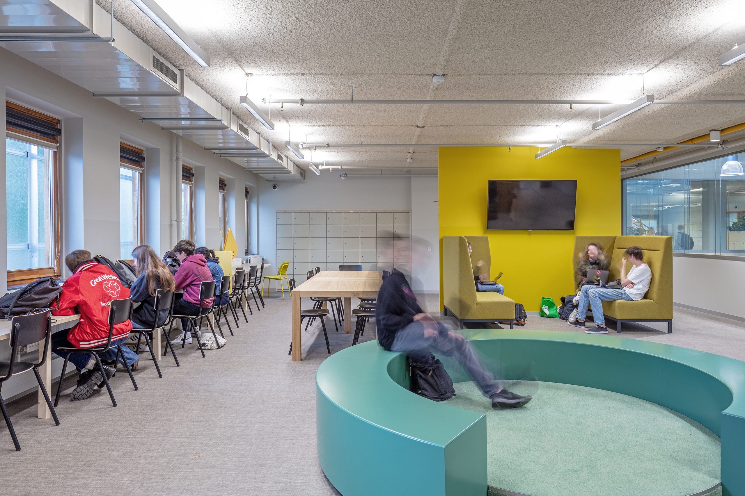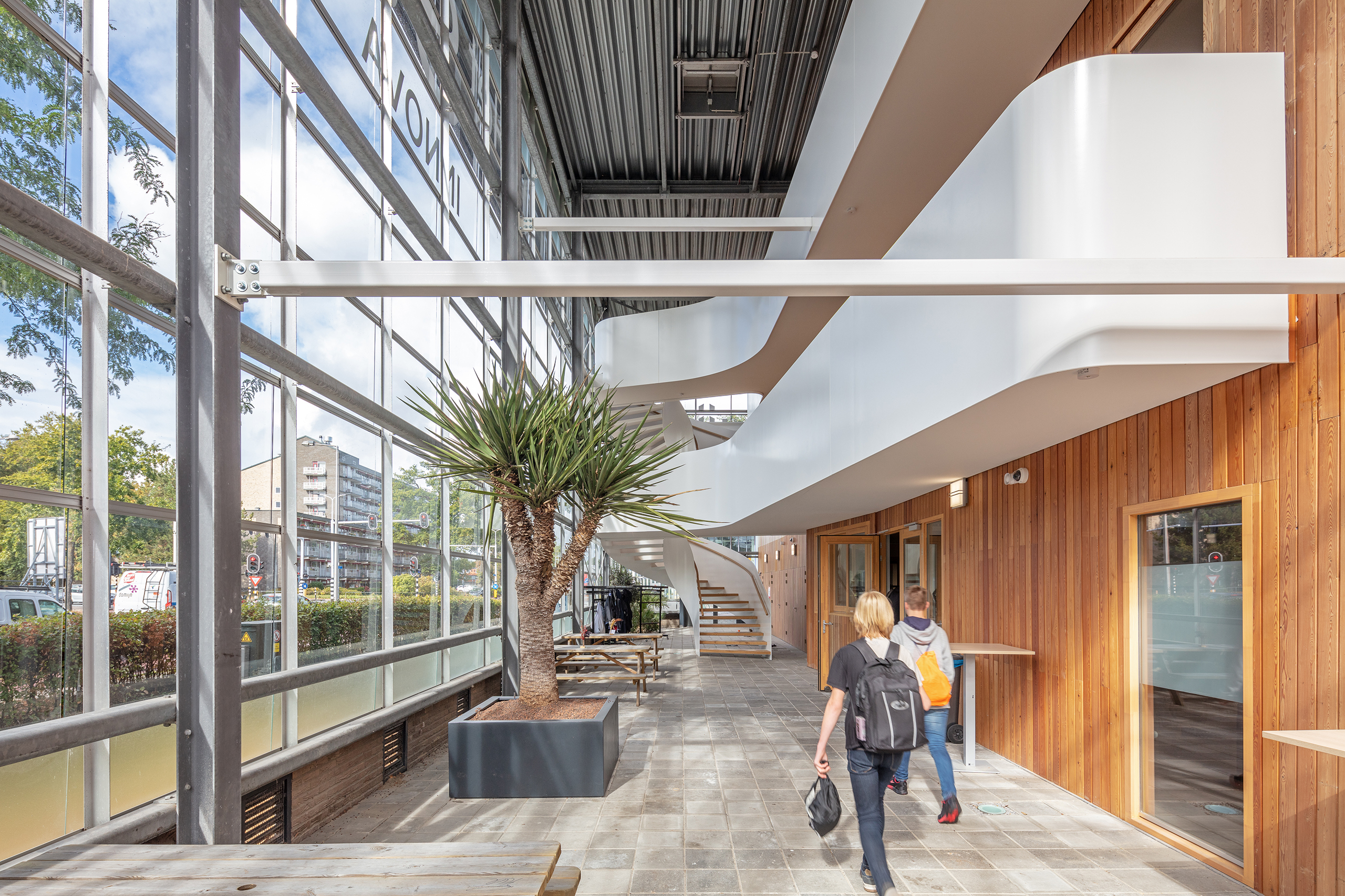 Door de oorspronkelijke functie van het gebouw waren er veel kleine, gesloten ruimten. De school heeft nu een open en transparante indeling met leer-domeinen en instructieruimten. We brachten veel daglicht in het gebouw door extra openingen in daken en vloeren te maken.