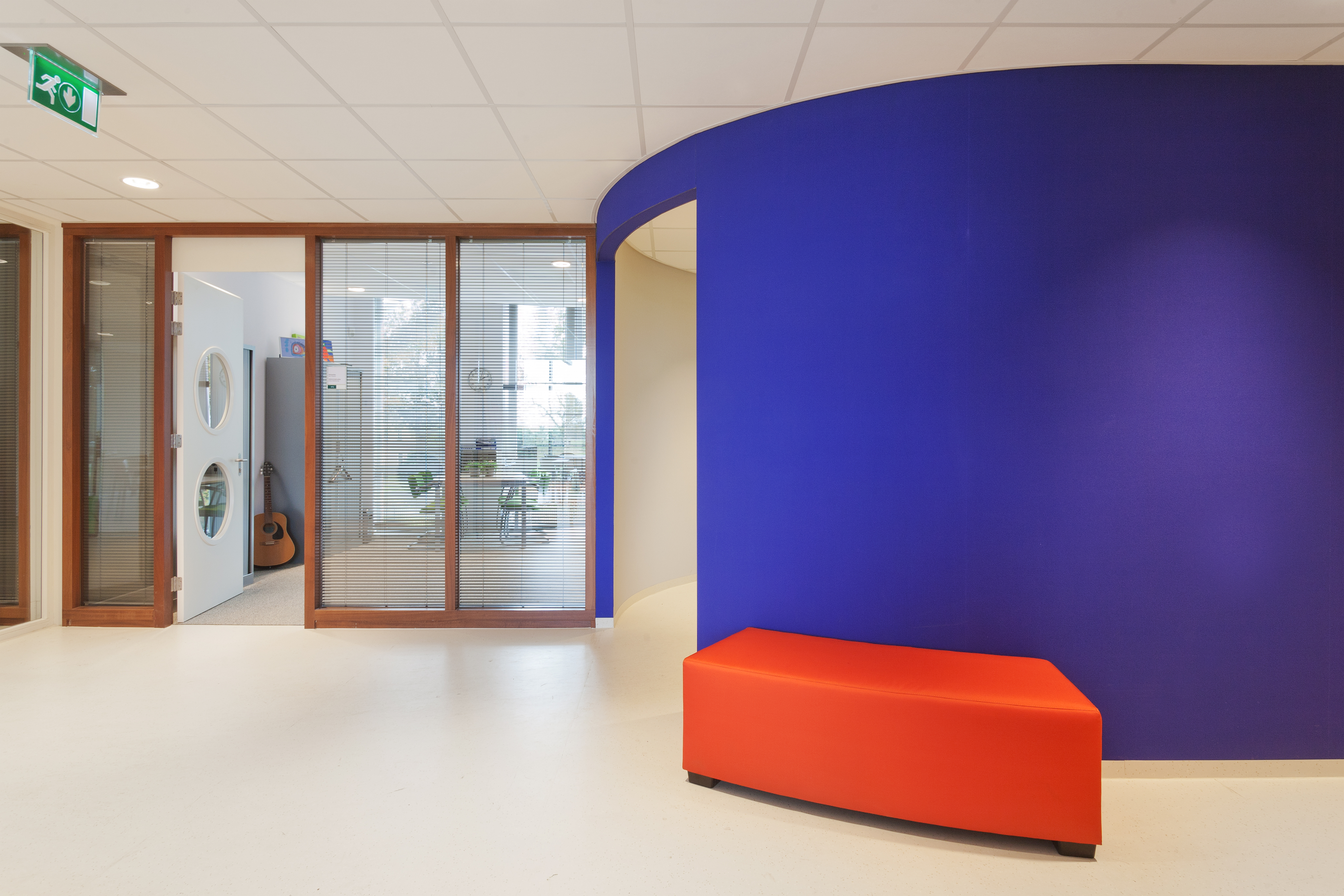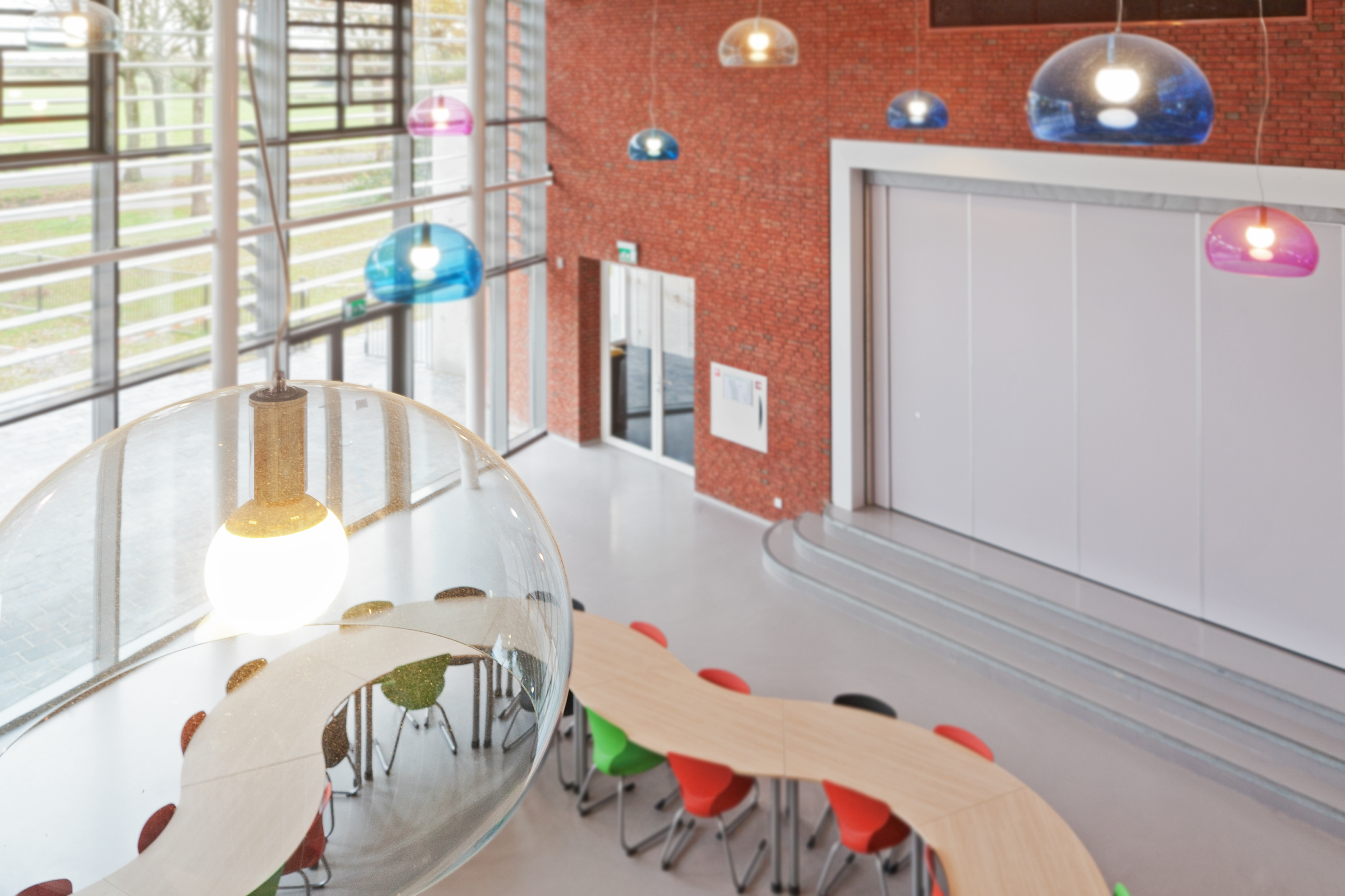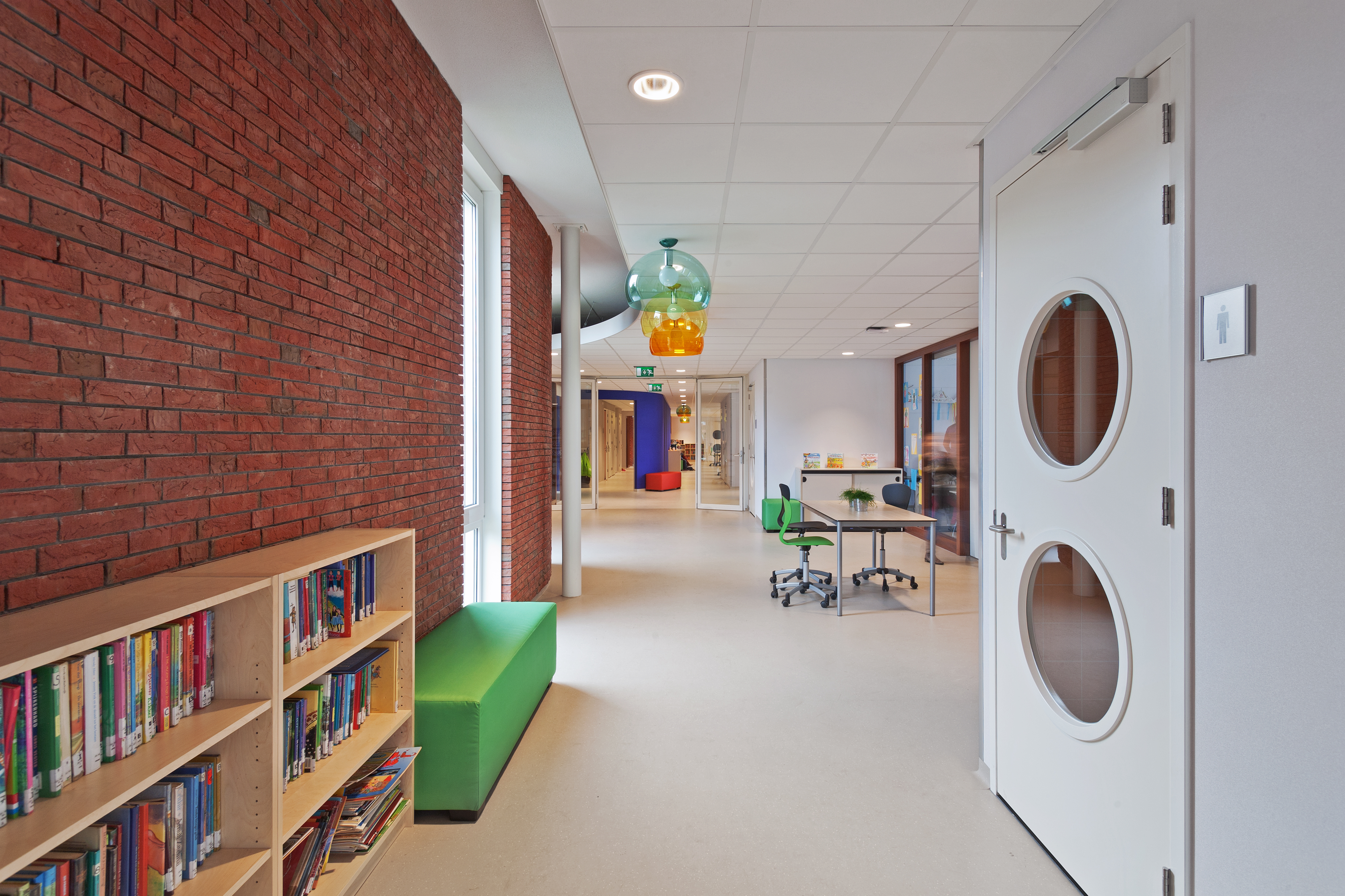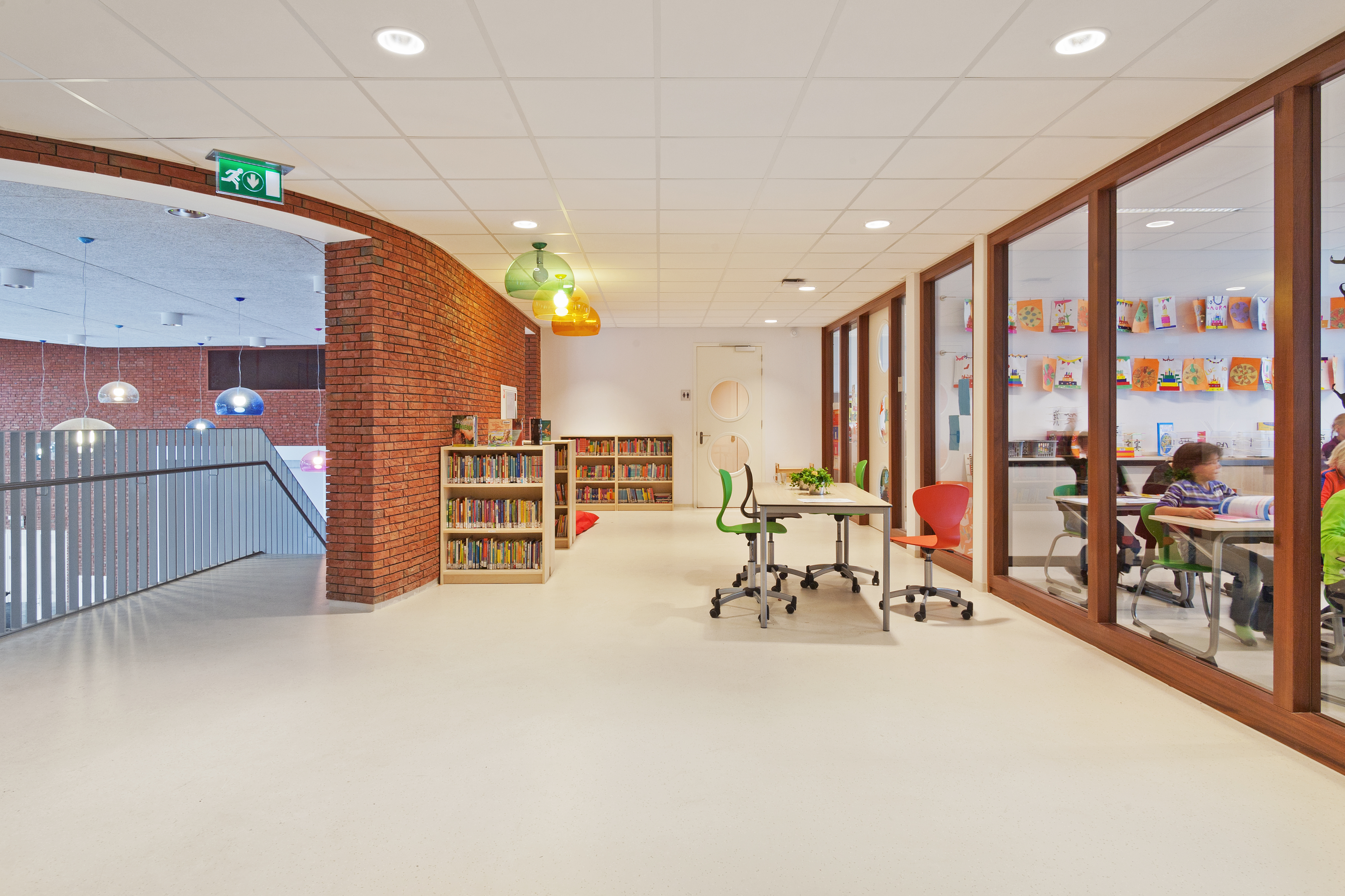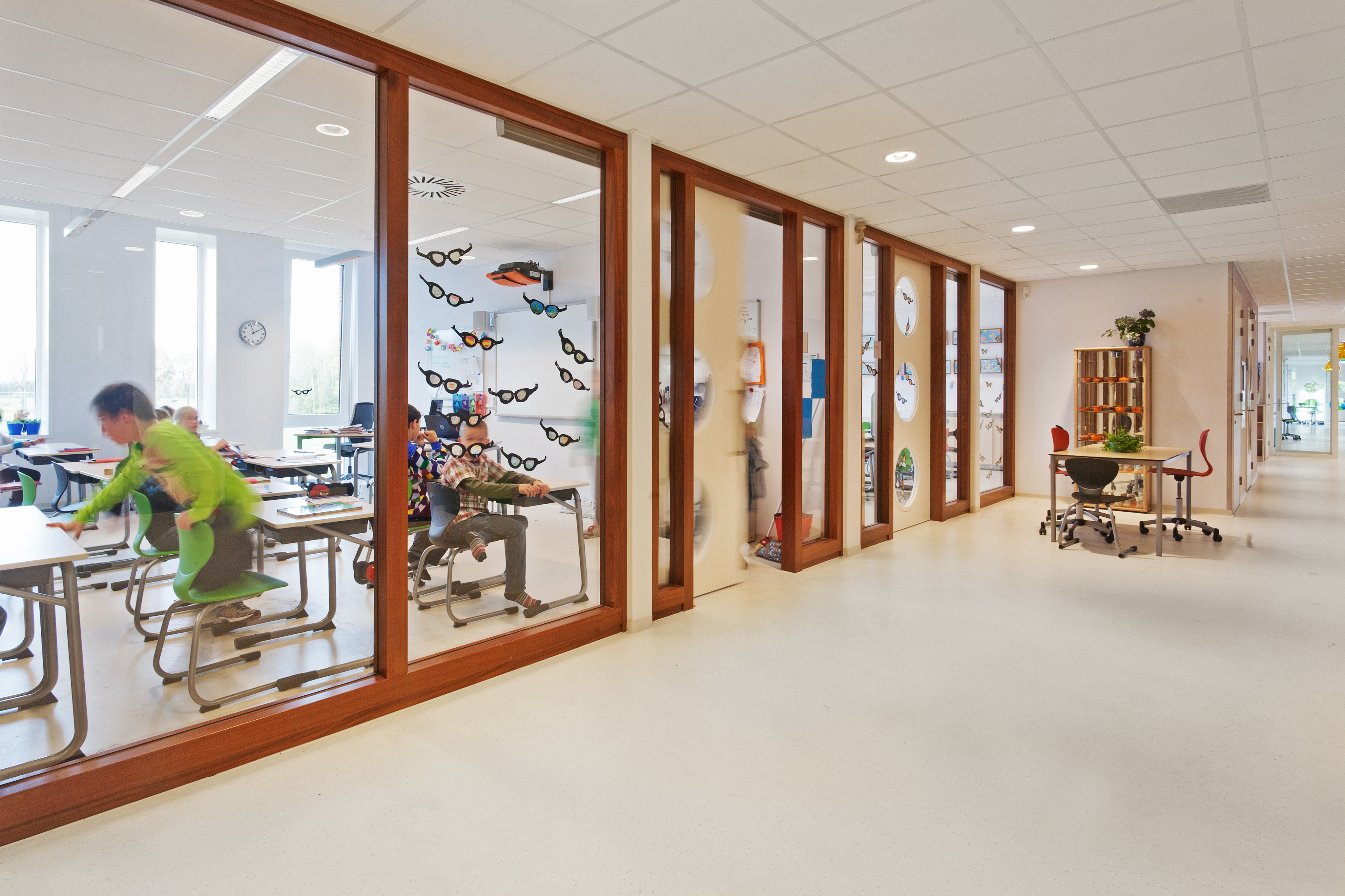 Het gebouw is transparant. Een uitnodigende en veilige plek voor kinderen. De groepen staan met elkaar in verbinding via de centrale hal en de leerpleinen. De centrale hal is gekoppeld aan een flexibele wand met doorgang naar het speellokaal en de sporthal. Beide kanten kun je aan elkaar koppelen of openzetten, waardoor ze geschikt zijn voor verschillende activiteiten. Toch is het karakter kleinschalig gebleven, geheel in lijn met de wens van de school. Zowel voor leerlingen als docenten een gemoedelijke omgeving, waar kinderen zich veilig voelen en zich optimaal kunnen ontwikkelen.